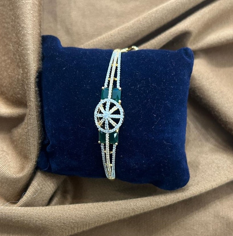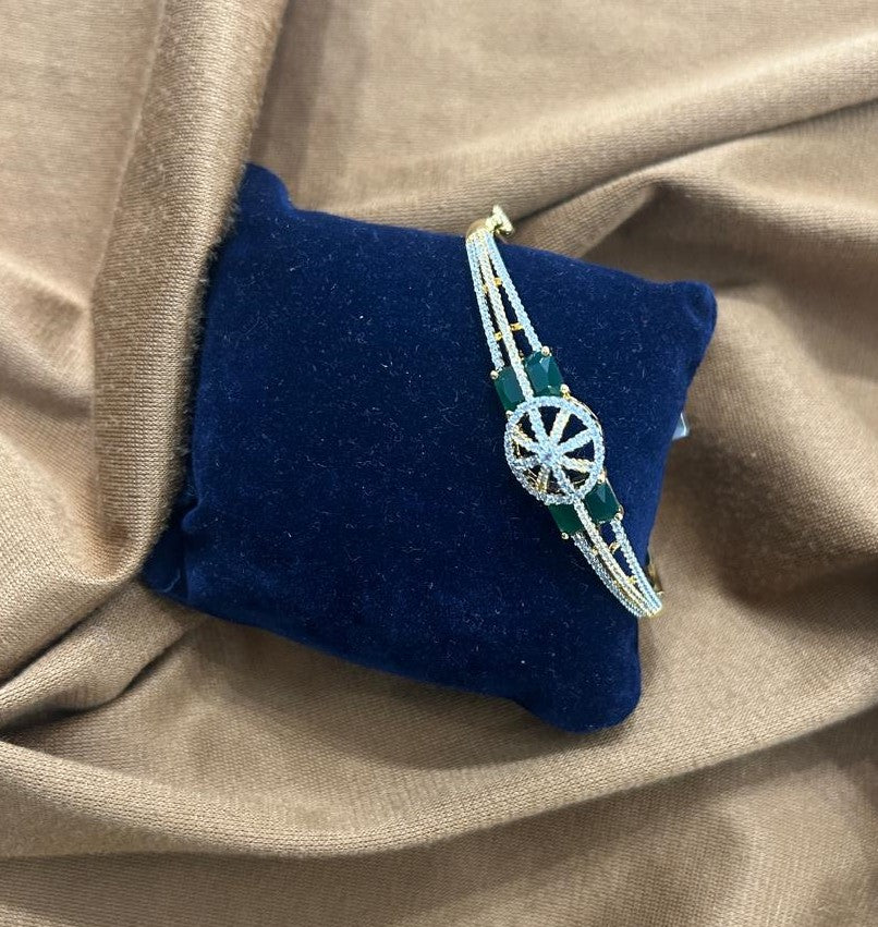 Crafted with a rich gold finish, sparkling CZ diamonds, and two elegant emerald-green stones, the bracelet features a stylish circular centerpiece that adds a luxurious touch.
