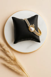 Elevate your style with this Elegant Pearl Bracelet, featuring a stunning central imitation pearl framed by sparkling Cubic Zirconia (CZ) stones. The bracelet’s floral accent design and fine gold finish add a touch of sophistication, making it a perfect blend of tradition and modern luxury. Ideal for festive occasions, weddings, or gifting, this piece brings effortless elegance to every outfit