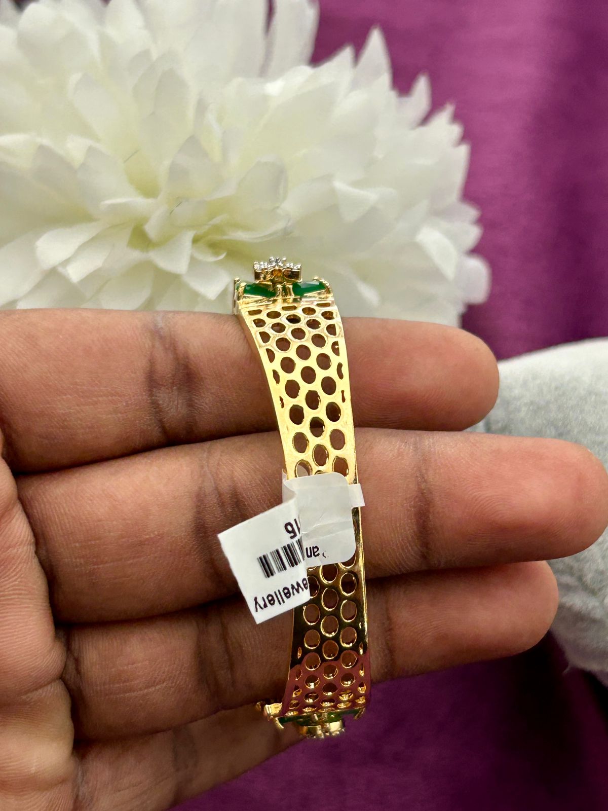 Make a royal statement with this Premium Emerald Green Stone Sparkle Openable Bracelet. Designed with rich emerald-green stones and embellished with stunning American diamond leaf motifs, this bracelet adds elegance and shine with every movement.