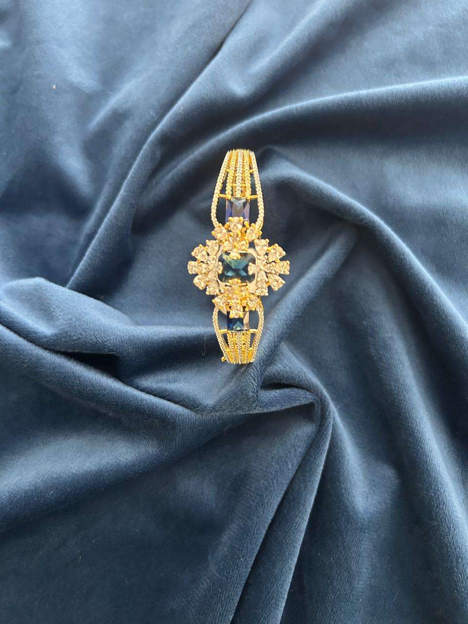 Elevate your festive and party look with this Premium Green Stone CZ Openable Bracelet, crafted in a luxurious gold finish. The bracelet features a bold emerald-green centerpiece surrounded by sparkling CZ stones arranged in a floral halo design, giving it a rich and elegant appeal.