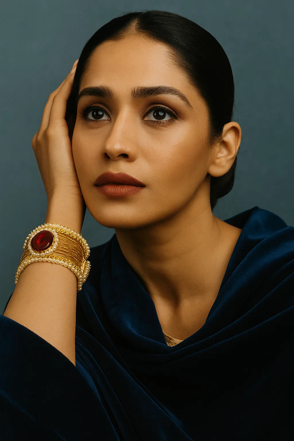 Bring home a touch of royal charm with this Royal Ruby Kundan Antique Bracelet, crafted in a luxurious antique gold finish. The bracelet features an eye-catching deep ruby centerpiece, surrounded by hand-set pearls and intricate carving work, giving it a premium heritage look.