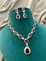 Make every moment shine with this Royal Ruby Diamond Look Necklace Set, crafted to perfection for women who love bold elegance. The necklace features deep red ruby stones framed in sparkling CZ diamonds, giving a luxurious and timeless appeal. The stunning teardrop pendant and matching earrings complete the royal look — perfect for weddings, receptions, and grand festive occasions.