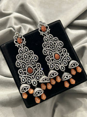 Make a bold statement with our Orange Stone Long AD Designer Earrings, featuring an exquisite filigree pattern crafted with premium American Diamonds. The earrings are highlighted with stunning orange faceted drops and matching center stones, adding a vibrant pop of color to any outfit.