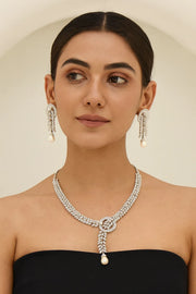 Silver Finish CZ Diamond Leaf Necklace Set with Pearl Drops Premium Party & Wedding Jewellery
