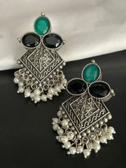 Oxidized Square Jhumka Earrings with Green & Black Stones and Pearl Drops