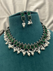 Elevate your ethnic look with this stunning Emerald Green Stone & Pearl Drop Choker Necklace Set. Featuring rectangular green stones beautifully aligned with delicate pearl danglers, this oxidized silver-tone choker is paired with matching earrings for a graceful finish. Perfect for weddings, festive occasions, Garba nights, and traditional celebrations, this jewelry set brings a royal charm to sarees, lehengas, and Indo-western outfits.