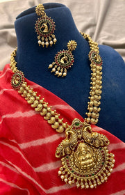 Celebrate tradition and divinity with this Antique Lakshmi Temple Necklace Set, featuring a grand Lakshmi pendant adorned with twin peacock motifs, intricate detailing, and pearl hangings. The necklace is complemented by beautifully designed matching earrings with red and green stone accents, giving it a regal charm. Perfect for weddings, festive occasions, and cultural ceremonies, this temple jewellery set embodies elegance and heritage in every detail.
