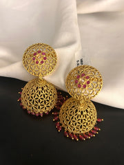 Traditional Gold Finish Jhumka Earrings with Ruby Beads