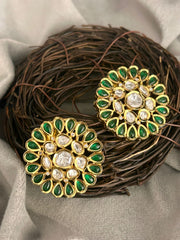Elevate your ethnic look with our Green Kundan Round Stud Earrings, featuring a classic floral pattern in deep green and radiant white stones. The circular design is surrounded by tear-drop green enamel petals and kundan-style stones, all set in a rich gold tone. These earrings reflect the timeless charm of traditional craftsmanship, perfect for festive occasions, weddings, or everyday elegance.