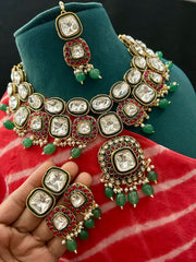 Red & Green Kundan Bridal Necklace Set with Earrings & Tikka