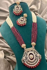 Radiate royalty with this Ruby Beads & Diamond Look Necklace Set, featuring a grand pendant embellished with sparkling stones and ruby red drops. The multi-string ivory and ruby bead design adds a regal touch, while the intricate pendant detailing enhances its luxurious charm. Paired with matching statement earrings, this set is a perfect choice for weddings, receptions, and festive occasions.