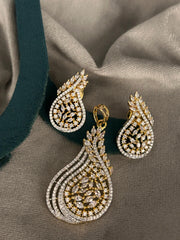 Adorn yourself with royal elegance through our Golden Regal Paisley Pendant Set. Inspired by classic Indian paisley motifs, this exquisite set features intricate filigree work, sparkling CZ diamonds, and graceful curves in a rich gold finish. A luxurious choice for festive wear, weddings, or gifting timeless beauty.