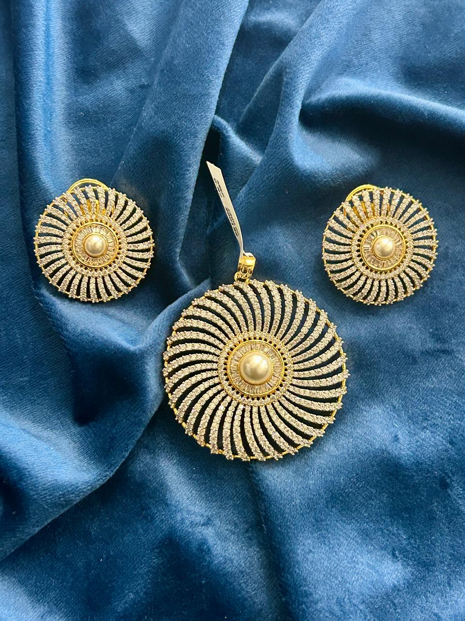 The pendant features a large round designer frame decorated with concentric CZ-lined rays, giving it a radiant sunburst look. At the center sits a classic pearl dome, adding sophistication and timeless elegance. The matching earrings mirror the exact same royal design, creating a complete, coordinated look perfect for festive occasions and special events.