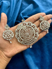 Grand Silver Finish CZ Diamond Pendant Set with Earrings Luxury Bridal & Festive Jewellery