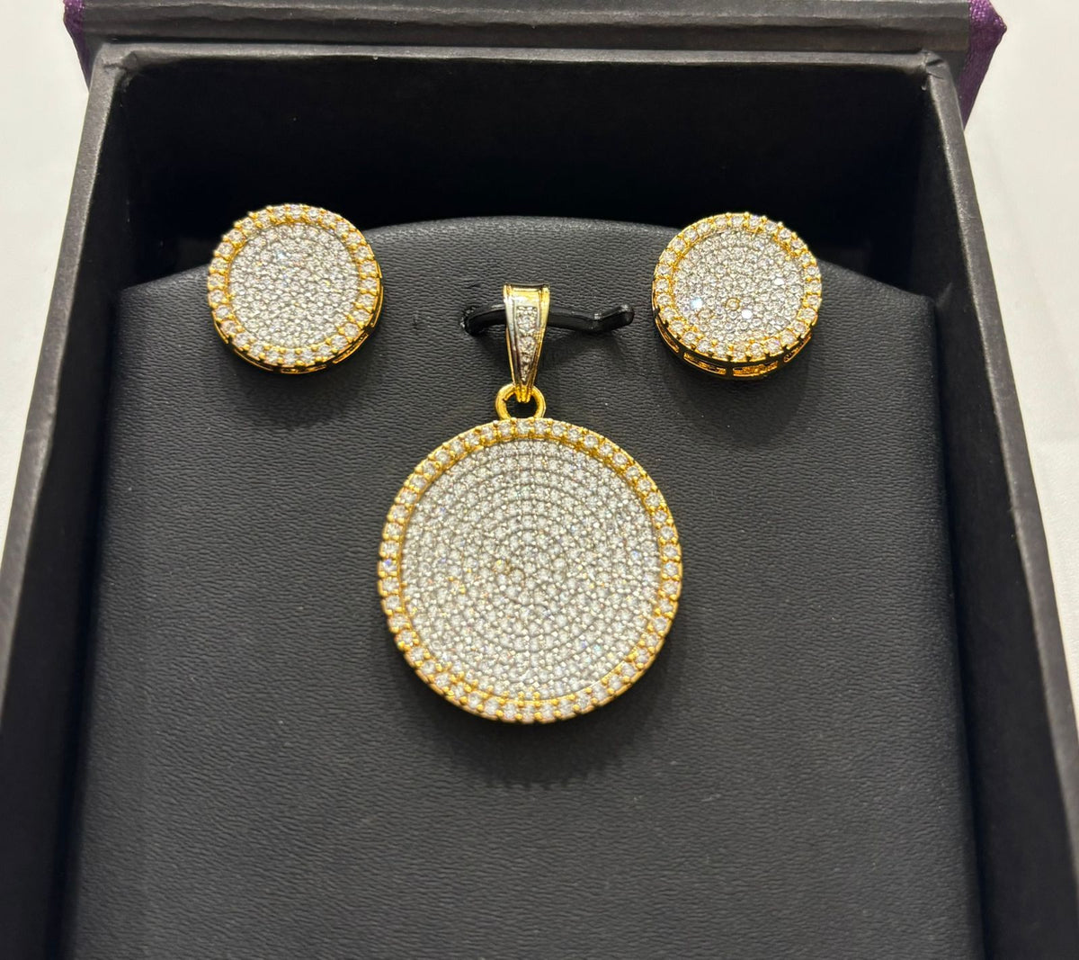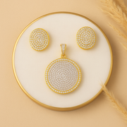 Add effortless sparkle to your style with this Round Full-AD Diamond Pendant Set. The pendant and matching earrings are beautifully encrusted with micro-paved CZ diamonds, creating a luxurious all-around shimmer. The gold finish adds a subtle warmth that complements both ethnic and Western looks. Perfect for parties, festive occasions, and gifting, this timeless design brings a touch of everyday elegance to your jewellery collection.