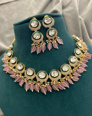 Pastel Pink Beaded Kundan Necklace Set – Elegant Gold & Green Finish