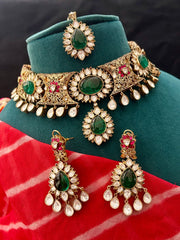 Royal Green Kundan Choker Necklace Set with Earrings & Maang Tikka