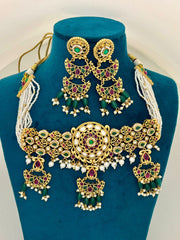 a touch of royal elegance to your ethnic look with this Royal Kundan Beaded Choker Necklace Set. Beautifully handcrafted with intricate detailing, this choker features traditional Kundan stones in shades of green, ruby red, and white. The centerpiece is accentuated with pearls and enamel work, creating a rich and timeless design. Paired with matching long chandbali-style earrings adorned with green beads and pearls, this set is perfect for weddings, festive occasions, and traditional celebrations. A statement piece that radiates heritage charm and luxury