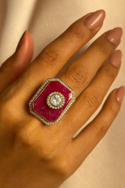 Luxury Ruby Kundan Statement Ring – Octagon Big Stone Adjustable