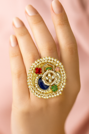 Make a bold and royal statement with this Multicolor Stone Pearl Adjustable Ring, designed with a mix of vibrant stones including red, green, blue, and kundan-style white stones. The entire piece is encircled with double rows of lustrous pearls, giving it a rich and regal look. Perfectly handcrafted, this ring blends traditional artistry with modern elegance, making it ideal for weddings, festive wear, and special occasions. Its adjustable band ensures a comfortable fit for every hand.