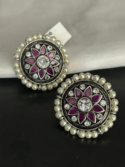 Oxidized Floral Stud Earrings with Ruby Stones & Pearl Border