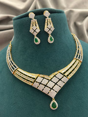 Make a bold statement with the Emerald Drop Diamond Look Necklace Set — a masterpiece that blends modern elegance with timeless beauty. This geometric-style necklace features a stunning combination of baguette and CZ diamonds set in a gold-tone base, accented by a teardrop-shaped emerald stone pendant. The matching earrings mirror the same sophisticated design, adding a perfect finishing touch. Ideal for parties, receptions, or festive occasions where you want to stand out with grace and luxury.