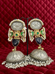 The grand oxidised dome jhumka at the bottom is adorned with heavy pearl tassels, adding movement and elegance to every look.