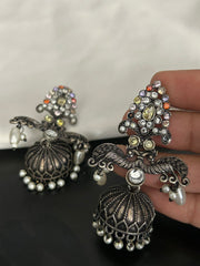 Antique Oxidized Peacock Design Jhumka Earrings with Multicolor Stones