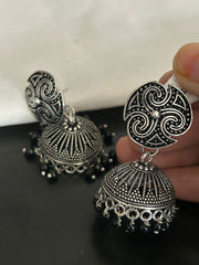 Make a bold style statement with these Oxidized Silver Dome Jhumka Earrings featuring an intricate tribal swirl design. Crafted with precision, the detailed dome pattern and black bead accents enhance their traditional yet trendy look. Perfect for pairing with sarees, lehengas, kurtis, or Indo-fusion outfits, these jhumkas are an essential addition to your ethnic jewelry collection. Lightweight and durable, they are ideal for festive occasions, weddings, and daily wear.