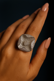 Shine bright with our Luxury Diamond Pave Statement Ring, a true masterpiece of elegance. Featuring a unique floral-square design encrusted with dazzling pave-set CZ stones, this ring radiates brilliance from every angle. The high-polish silver finish enhances its premium appeal, making it the perfect accessory for weddings, parties, and grand occasions.