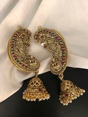 Bring home the elegance of tradition with these Antique Peacock Design Temple Jhumka Earrings. Crafted in a unique paisley-shaped frame, studded with ruby-red and emerald-green stones, these earrings reflect timeless temple jewellery artistry. The intricate design is enhanced with hanging gold-finish jhumkas adorned with pearl drops, adding richness to any festive or bridal look. Perfect for weddings, pujas, cultural events, and heritage-inspired styling.