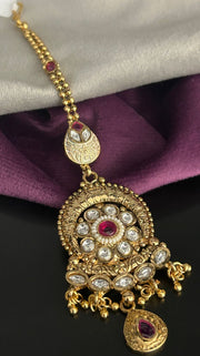 Antique Ruby Kundan Maang Tikka with Pearl Detailing