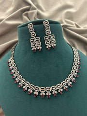 Make a bold yet elegant statement with the Crimson Spark Diamond Look Necklace Set. Designed with geometric CZ diamond motifs and deep maroon teardrop accents, this necklace set strikes the perfect balance between modern design and classic charm. The matching long earrings add a graceful touch, making it an ideal choice for weddings, festive events, and grand celebrations.