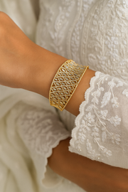 Shine bright with this golden CZ baguette openable bracelet, crafted with multiple rows of baguette-cut and round CZ stones for a dazzling diamond-like appeal. The intricate lattice design and gold-plated finish make it a luxurious accessory, perfect for weddings, receptions, festive events, and grand parties.